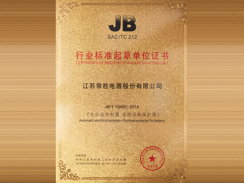 常勝電器行業(yè)標(biāo)準(zhǔn)起草單位證書